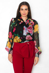 Prosojna bluza z bogatim cvetličnim potiskom prinaša izrazit in živahen videz. Pentlja ob izrezu doda prefinjeno ženstvenost.
