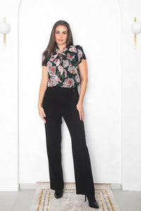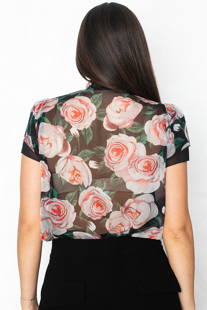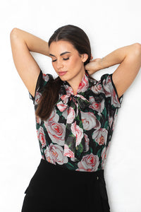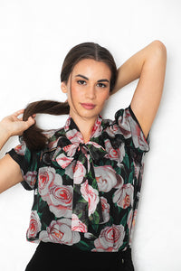 Prosojna lahkotna bluza s potiskom vrtnic, čipkastimi detaili in pentljo izraža popoln sofisticiran videz. Izredno mehka in prijetna na otip. Podložena s svilo.