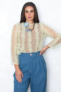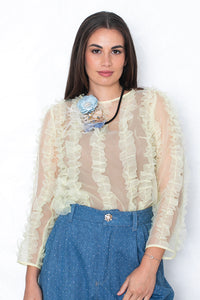 Bluza je narejena iz pastelno rumene organze, ki združuje lahkotnost in romantično eleganco. Igrivi volančki dajejo ženstven in unikaten videz.