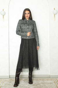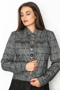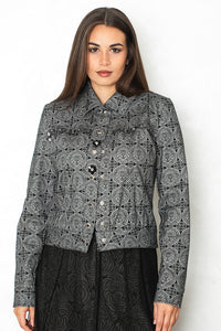 Jakna z grafičnim vzorcem pritegne s svojim bogatim motivom. Priležno do telirani kroj z volančkom daje moderen pridih. Čudovito se poda k enobarvnim hlačam ali til krilu za sofisticiran kontrast ali kot statement kos čez enostavno obleko za urban chic videz.