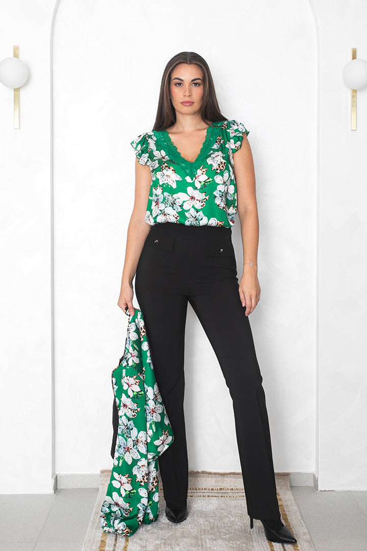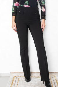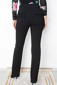Črne hlače ravnega kroja z elegantnimi okrasnimi gumbi prinašajo prefinjen stil.