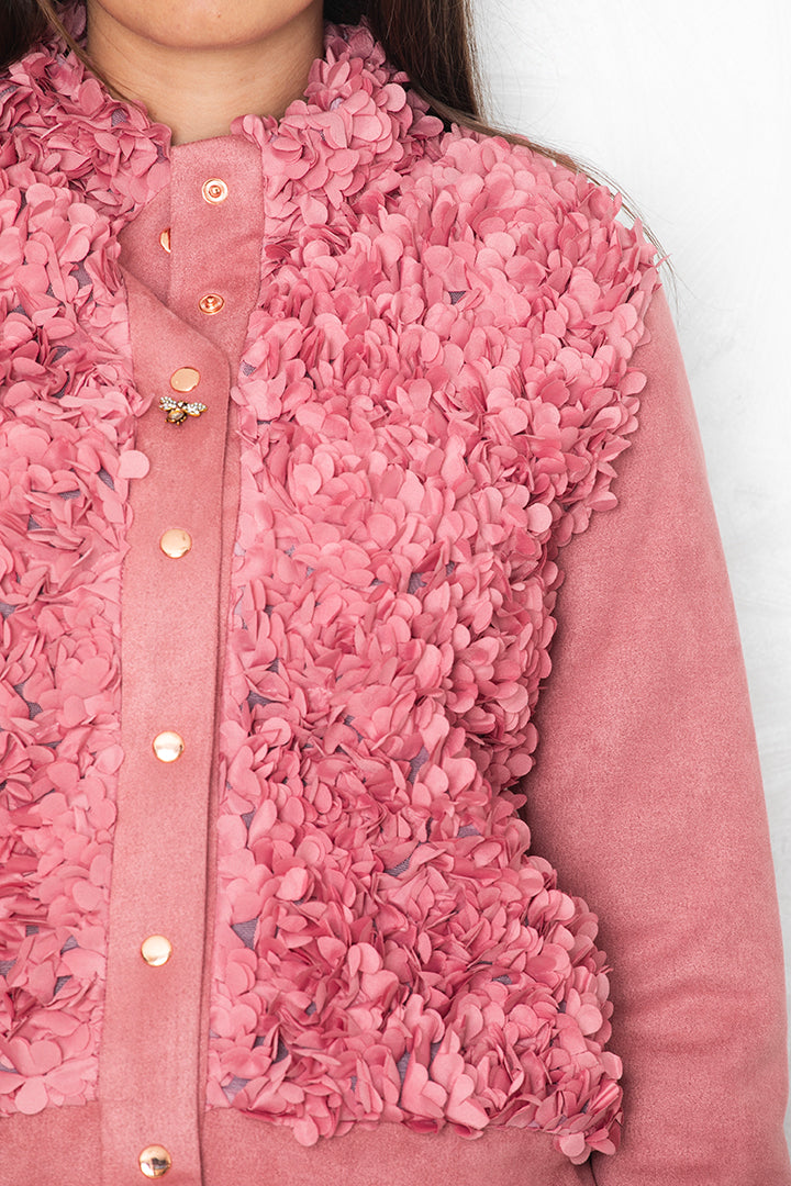 Jakna je izdelana iz mehkega skuba materiala. Spredaj je okrašena z bogatim 3D cvetličnim reliefom, ki ustvari razkošno teksturo. V romantičnem rožnatem tonu jo lahko nosimo kot statement kos - popolna ob enostavnih hlačah ali krilu za sodoben, eleganten videz.