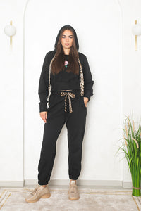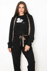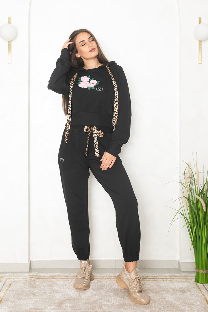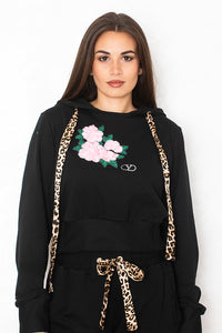 Črna hoodie jopica združuje športno udobje z drznim modnim pridihom. Leopard vzorčaste vrvice ustvarijo kontrast k romantični roza cvetlični aplikaciji na sprednjem delu. Nosi jo s kavbojkami in supergami za casual chic videz ali kot igriv kontrast k plisiranem ali til krilu.