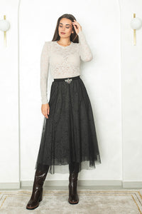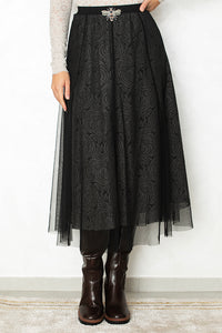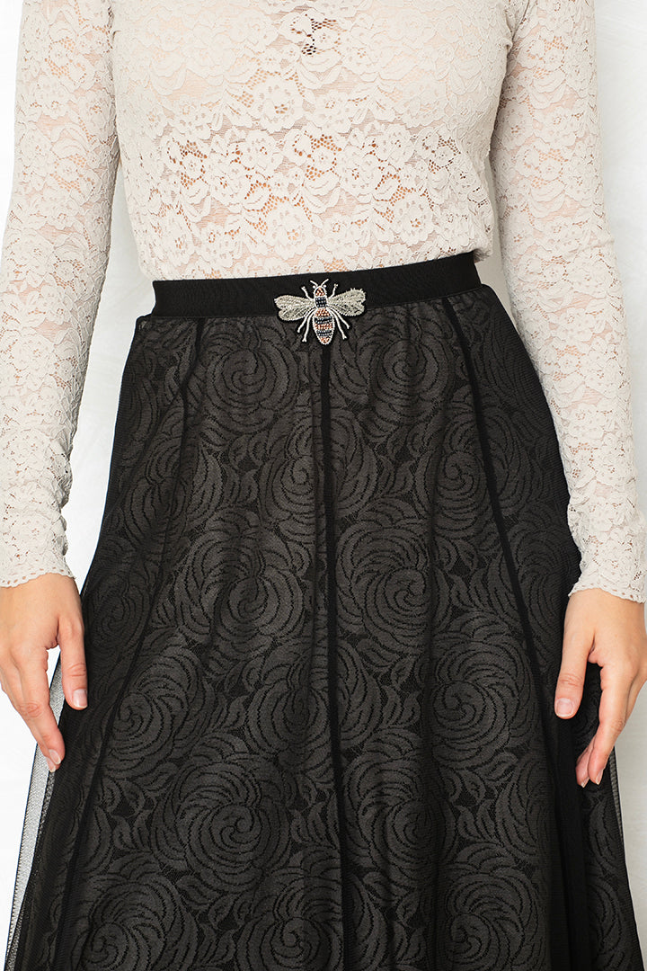 Črno midi krilo narejeno iz treh plasti, daje prefinjen izgled in neverjetno udobje pri nošenju. Spodnja plast je kakovosten črn saten, ki ima funkcijo podloge. Druga plast je elegantna temno siva čipka z izvezenimi vrtnicami, zgornja plast pa je lahkoten črn til.