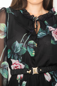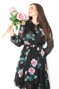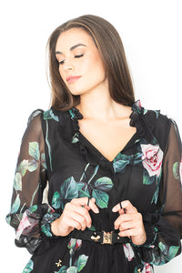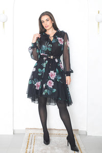 Lahka, prosojna šifonasta tkanina v globoki črni barvi z nežnim vzorcem. Krojena z z rahlo poudarjenim pasom in volančki, ki dodajo gibanje.