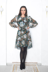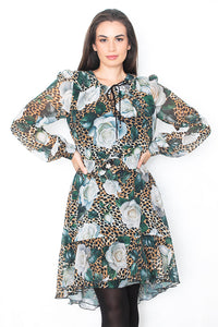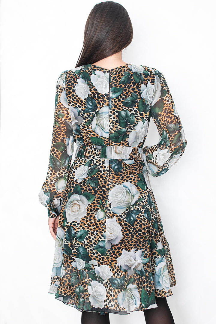 Lahkotna šifon obleka združuje divji leopardji vzorec z belimi vrtnicami za popoln kontrast drznosti in romantike. Volančki in pentlja pri vratu dodajo igrivost.