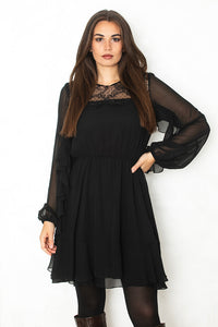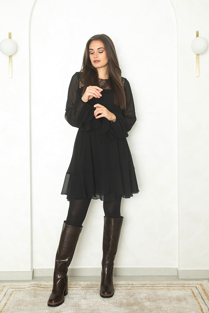 Črna obleka iz lahkotnega šifona združuje romantične in prefinjene detaile. Zgornji del krasi bogata čipka, medtem ko volančki ob rokavih in krilu dodajo fluidnost in ženstveno mehkobo. Idealna izbira za številne priložnosti.