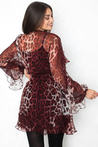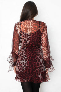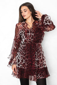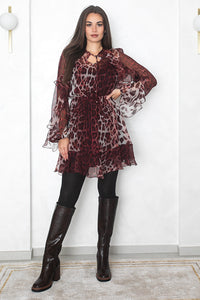 Prosojna lahkotna obleka z živahnim potiskom izstopa s svojo drznostjo. Volančki na rokavih in pentlja od izrezu dodajo igriv in eleganten značaj. Obleka ima prijetno elegantno in mehko podlogo.