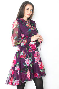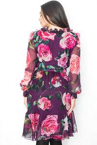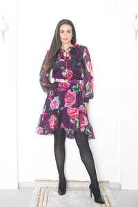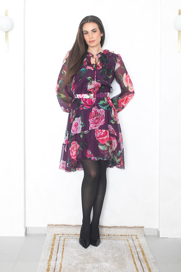 Lahka, prosojna šifonasta tkanina v globoki črni barvi z nežnim vzorcem. Krojena z z rahlo poudarjenim pasom in volančki, ki dodajo gibanje.