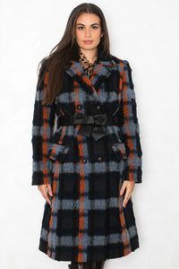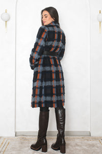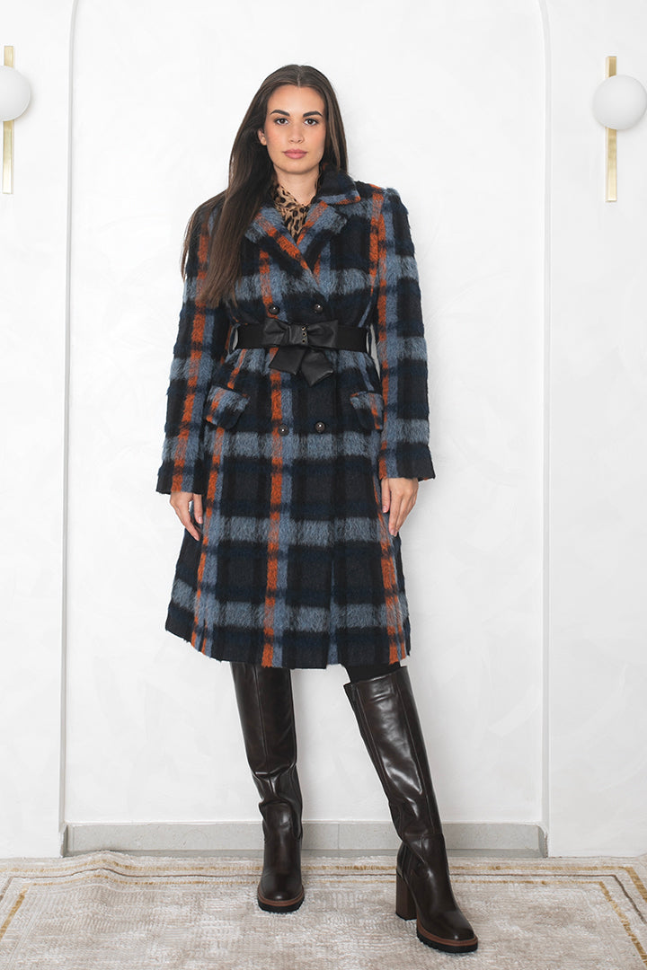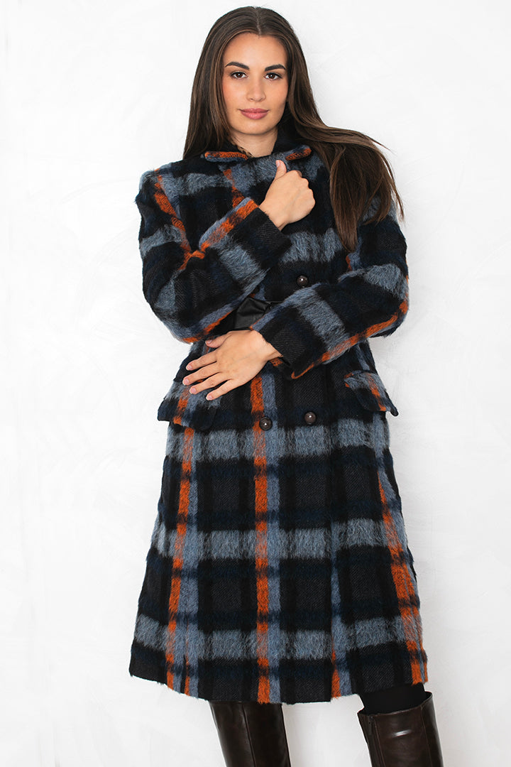 Plašč iz mehke volnene mešanice z izrazitim karo vzprcem vodtenkih črne, modre in oranžne. Dvojno zapenjanje z gumbi in kontrastni pas v imitaciji usnja, ki poudari silhueto telesa. Razkošen in topel model, ki ga lahko nosite kot glavni kos stajlinga.