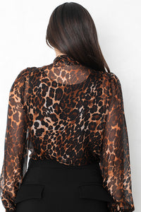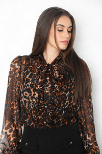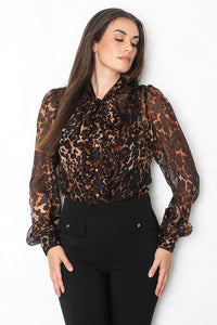 Prosojna šifon bluza z leopardjim vzorcem izžareva drznost in glamour. Čudovito se poda k enobarvnim hlačam ali krilu za izrazit modni statement.