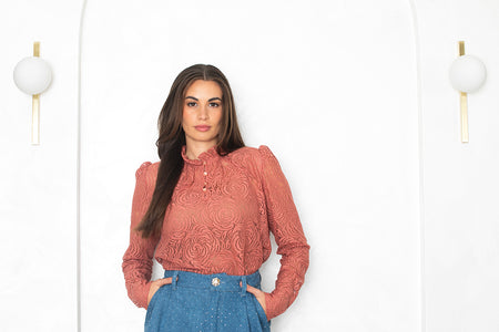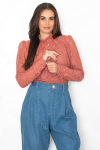 Bluzica je izdelana iz prefinjene čipke z motivom vrtnic in rahlo dvignjenim ovratnikom. V topli terakotni barvi deluje romantično in elegantno. Nosite jo z ozkimi hlačami, saten ali usnjenim krilom.