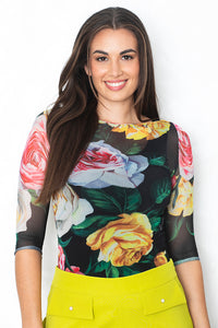 Črna prosojna elastična bluza s cvetličnim potiskom prinaša romantičen, a drzen pridih. Narejena je iz lahkotnega mrežastega materiala, idealna je za plastenje čez top in kombiniranj.