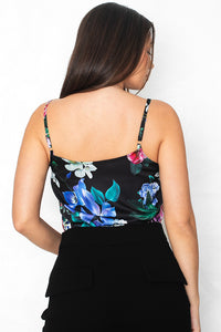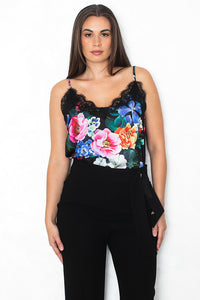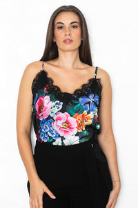 Črn top z naramnicami in bogatim vzorcem združuje zapeljivost in romantično eleganco. Odličen je kot samostojen statement kos ali pod suknjičem.
