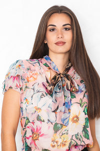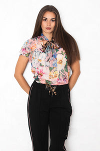 Lahkotna prosojna bluza v pastelno rožnatem odtenku s cvetličnim potiskom je romantična in ženstvena izbira. Drzna pentlja v leopardjem vzorcu doda nepričakovan kontrast in igriv modni preobrat.