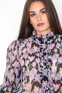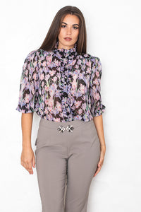 Bluza iz lahkotnega šifona z intenzivnim potiskom vijoličnih cvetov na temni podlagi. Stoječ ovratnik in drobni volančki vzdolž sprednje letvice dodajo romantično strukturo, ki se lepo uravnoteži s tri-četrt rokavi. Odlično se poda k elegantnim hlačam ali usnjenemu krilu za bolj casual look pa mirno uporabite svoj najljubši jeans.