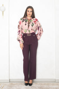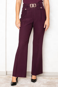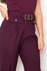 Elegantne hlače v globokem bordo tonu očarajo z zlato sponko in dekorativnimi gumbi. Nosite jih s svileno bluzo za večerno eleganco ali s strukturiranim blazerjem / jakno za močno dnevno kombinacijo.
