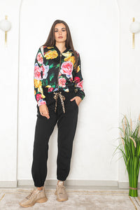 Jogger hlače v črni barvi združujejo udobje in moden pridih. Elastičen pas dopolnjuje kontrastna vrvica s cvetličnim vzorcem, ki doda ženstveno igrivost.
