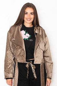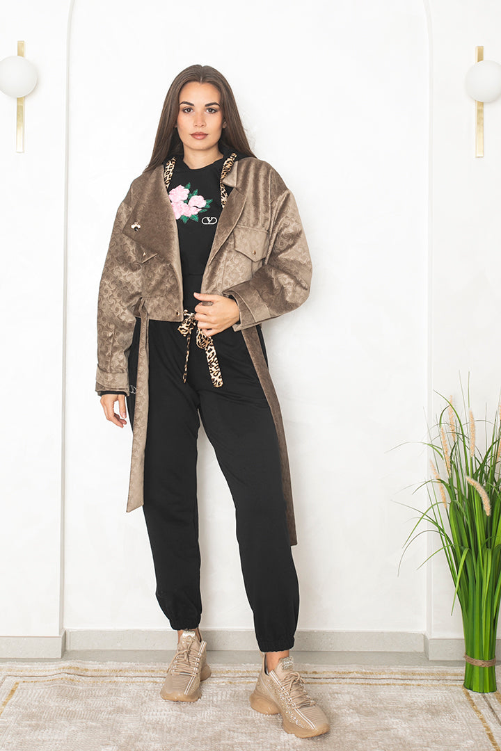 Jakna v peščeno bež odtenku je izdelana iz bogatega žakardnega materiala s subtilnim geometrijskim vzorcem. Prevelik ovratnik in pas za zavezovanje oblikujeta sodobno, a ženstveno silhueto, medtem kot broška v obliki čebele doda nepričakovan 'couture' detail. Popolna izbira za čez dnevne obleke ali kombinacijo s kavbojkami za 'off duty' videz.