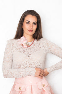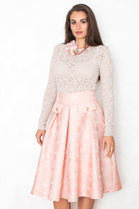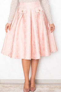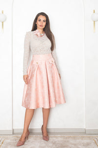 Svetleče krilo v nežno roza tonu očara z Jacquard cvetličnim vzorcem, ki mu daje prefinjen, couture značaj. To A-linijsko krilo se odlično poda z nevtralno bluzo ali enostavnim topom.