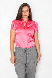 Bluza iz elastičnega svilenega satena v rožnatem odtenku z rahlim leskom, nežno objame silhueto. Odlično se poda k ozkim hlačam ali krilu, za ženstven a vsakdanji videz.