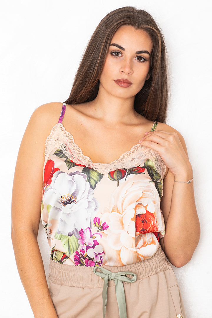 Top z naramnicami in bogatim vzorcem združuje zapeljivost in romantično eleganco. Odličen je kot samostojen statement kos ali pod suknjičem.