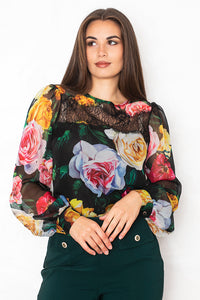 Bluza iz lahkotnega šifona je okrašena z bogatim potiskom vrtnic v živih barvah, ki izstopajo na temni podlagi. Čipkast del poskrbi za prefinjeno teksturo. Nosi se lahko spuščeno čez ozke hlače ali zataknjeno vi midi krilo za izrazit ženstven učinek.