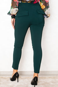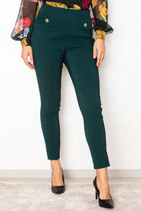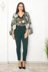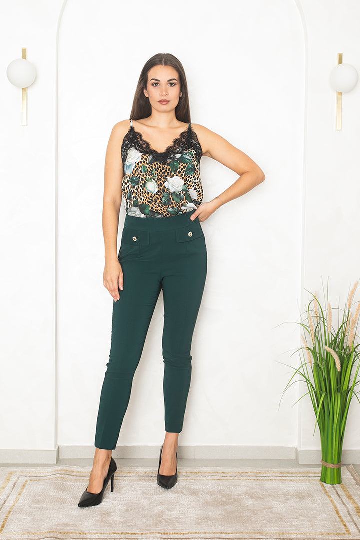 Hlače v globokem petrol zelenem odtenku očarajo z minimalističnem krojem in kristalnimi gumbi pod pasom. Prefinjen detail jim daje luksuzen značaj, hkrati pa ostajajo vsestranske. Popolne so z bluzo in salonarji za eleganten videz ali s pletenim puloverjem in mokasini za šik dnevni videz.
