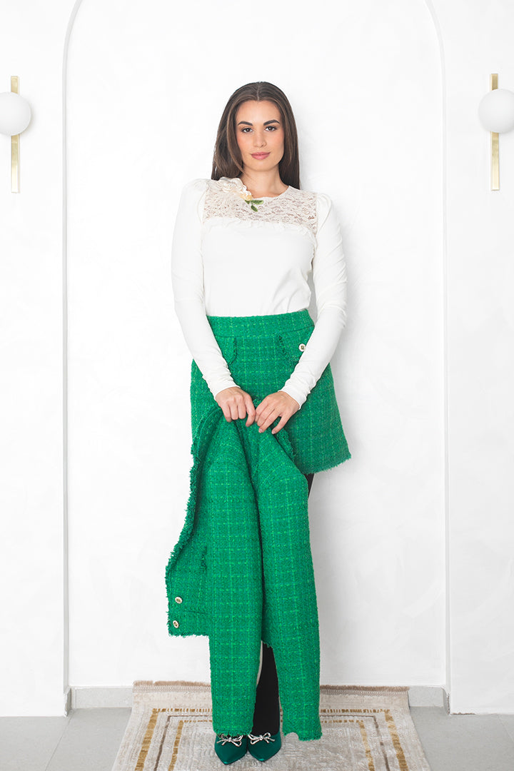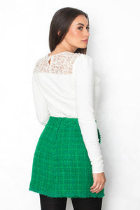 Zgornji del krasijo bogati čipkasti detaili, ki dodajo prefinjeno eleganco.